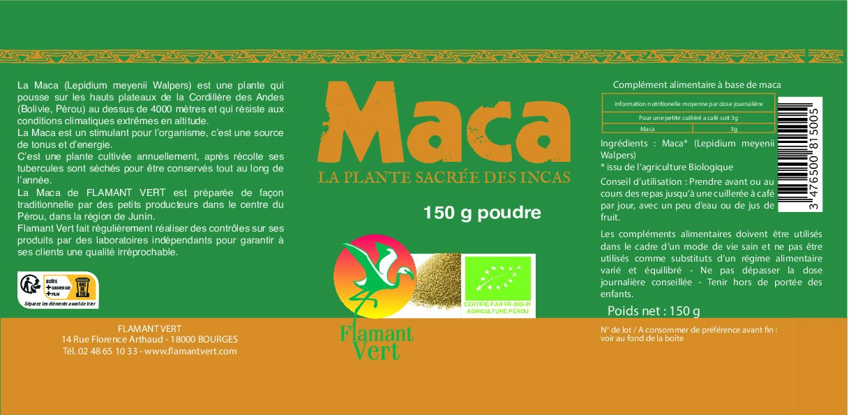 La maca de Flamant Vert est bio et préparée de façon traditionnelle par des petits producteurs dans le centre du Pérou, elle est certifiée Bio et est issue du commerce équitable (certification IMO).